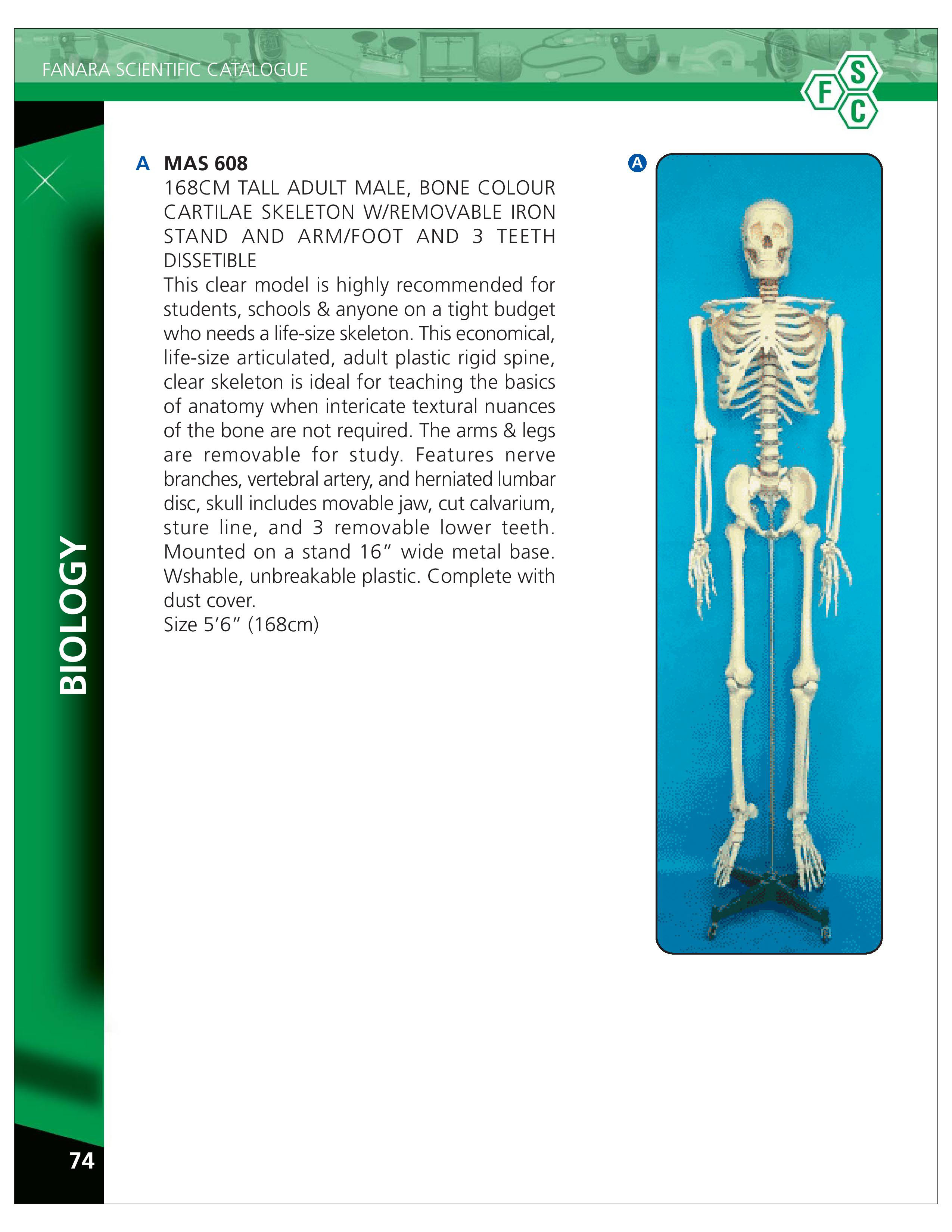 Skeleton Bone Colour Cartilage Male Adult 168 cm Tall, Removable Iron Stand, Arm/Foot, 3 Teeth- MAS 608