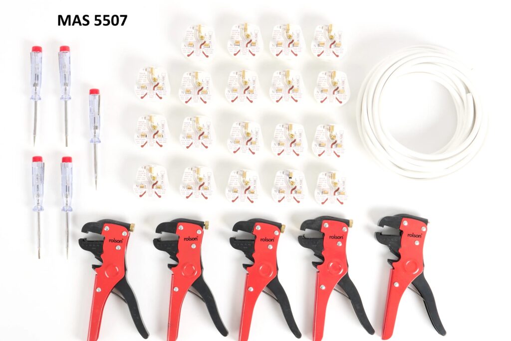 3-pin Plug Wiring Classroom pack – MAS 5507 Kit Contains 10m Flexible Mains Cable 6A 300V 20 x Mains plugs 5 x Automatic Wire Strippers 5 x Mains Test Screwdriver Components also sold separately for larger groups
