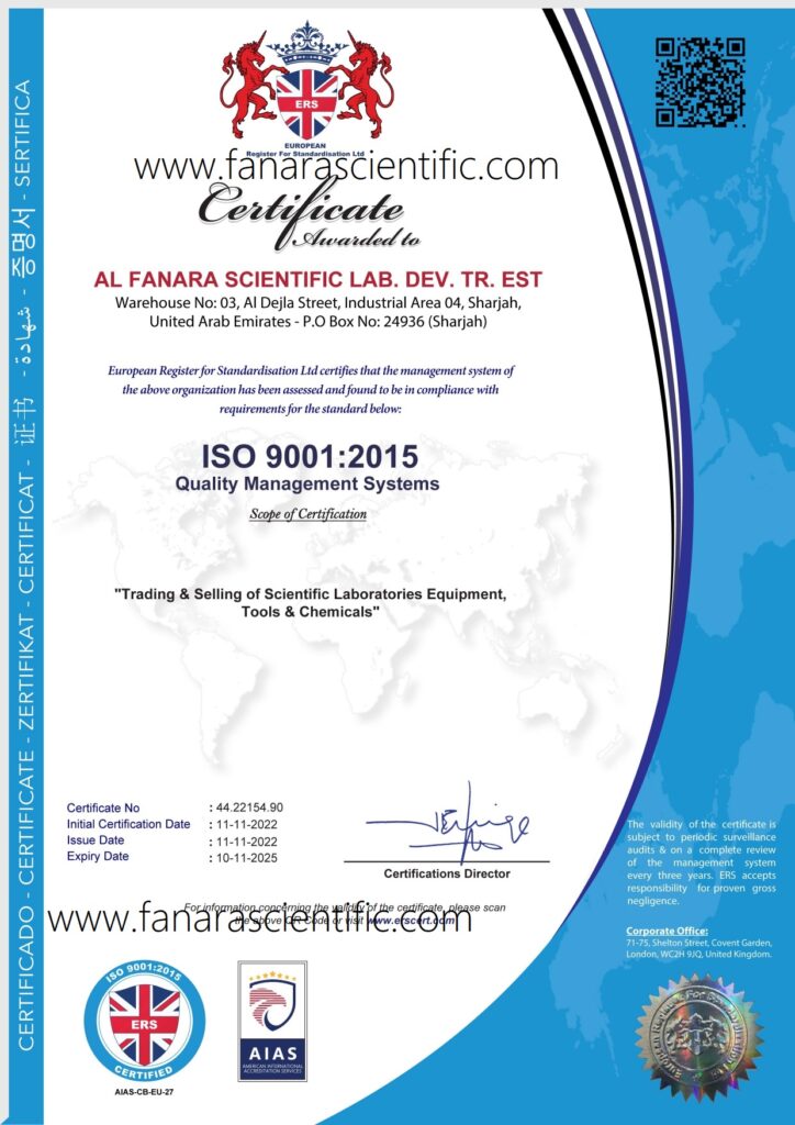 Al Fanara Scientific Lab devices Trading is ISO 9001 Certificated Supplier.