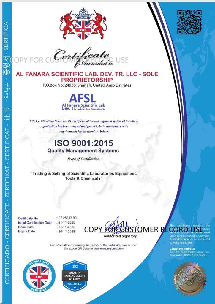 Al Fanara Scientific Lab devices Trading  is ISO 9001 Certificated Supplier.