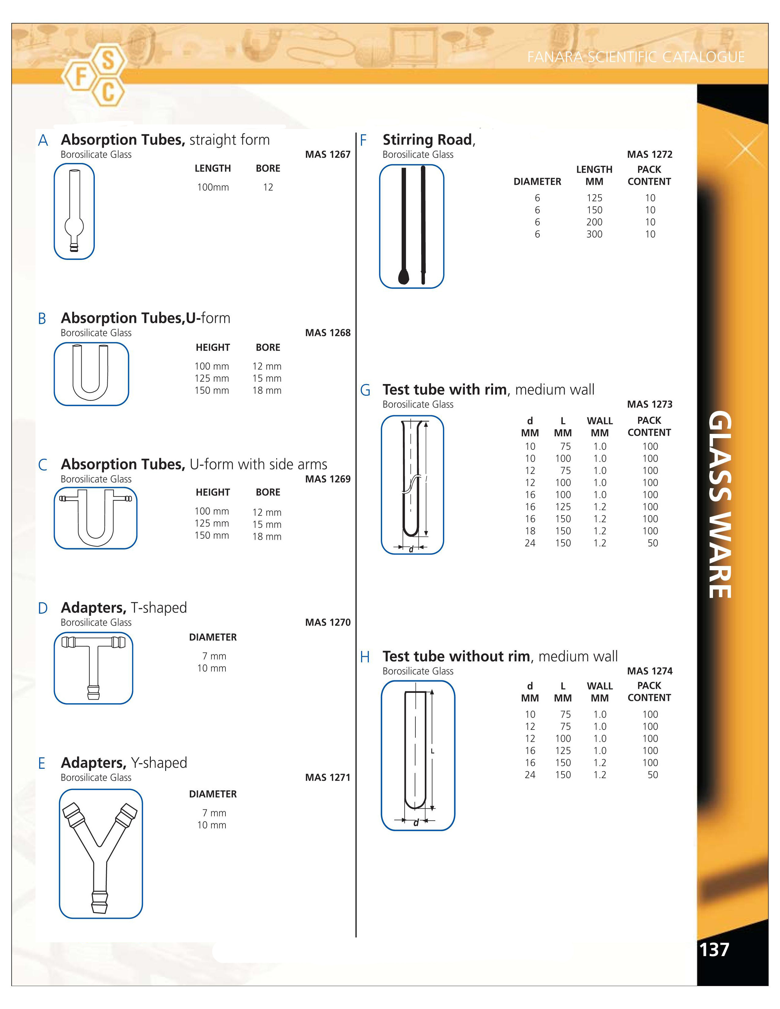 Absorption, U-shape, T-Shape, Y-Shape Tubes, Stirring Rod, Test Tubes- MAS 1267-1268-1269-1270-1271-1272-1273-1274