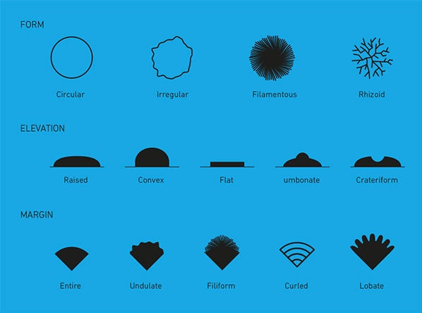 - Form – what is the basic shape of the colony? For example, circular, filamentous, etc.