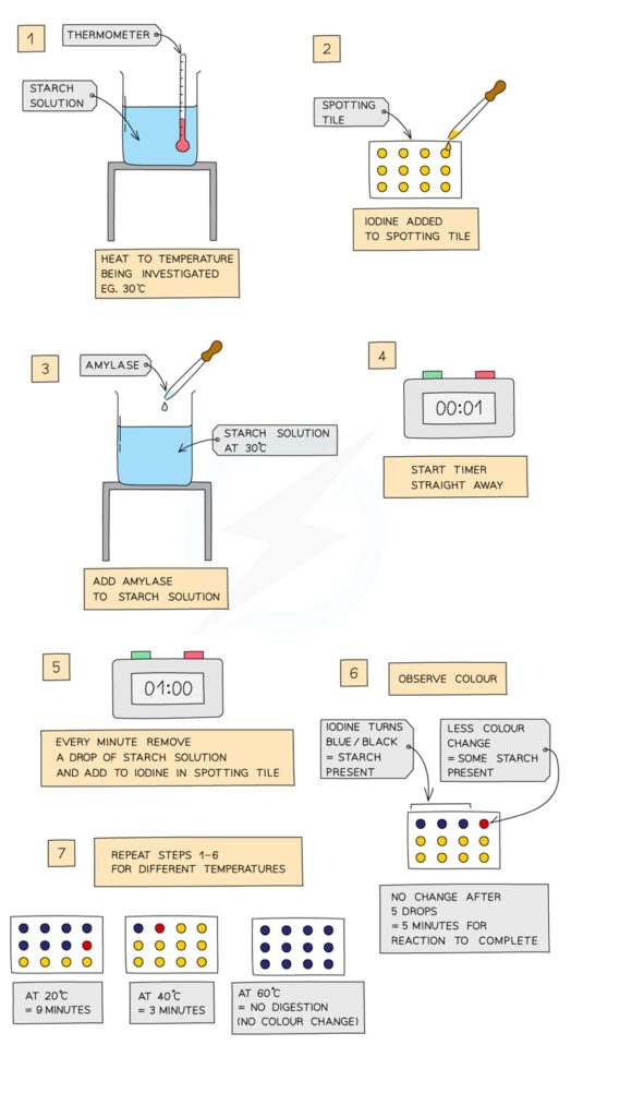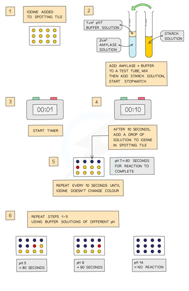 - Repeat experiment at different pH values – the less time the iodine solution takes to remain orange-brown, the quicker all the starch has been digested and so the better the enzyme works at that pH