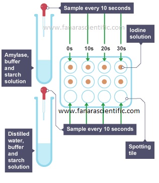 - This is continued until the iodine stops turning blue-black (this means there is no more starch left in the solution as the amylase has broken it all down)