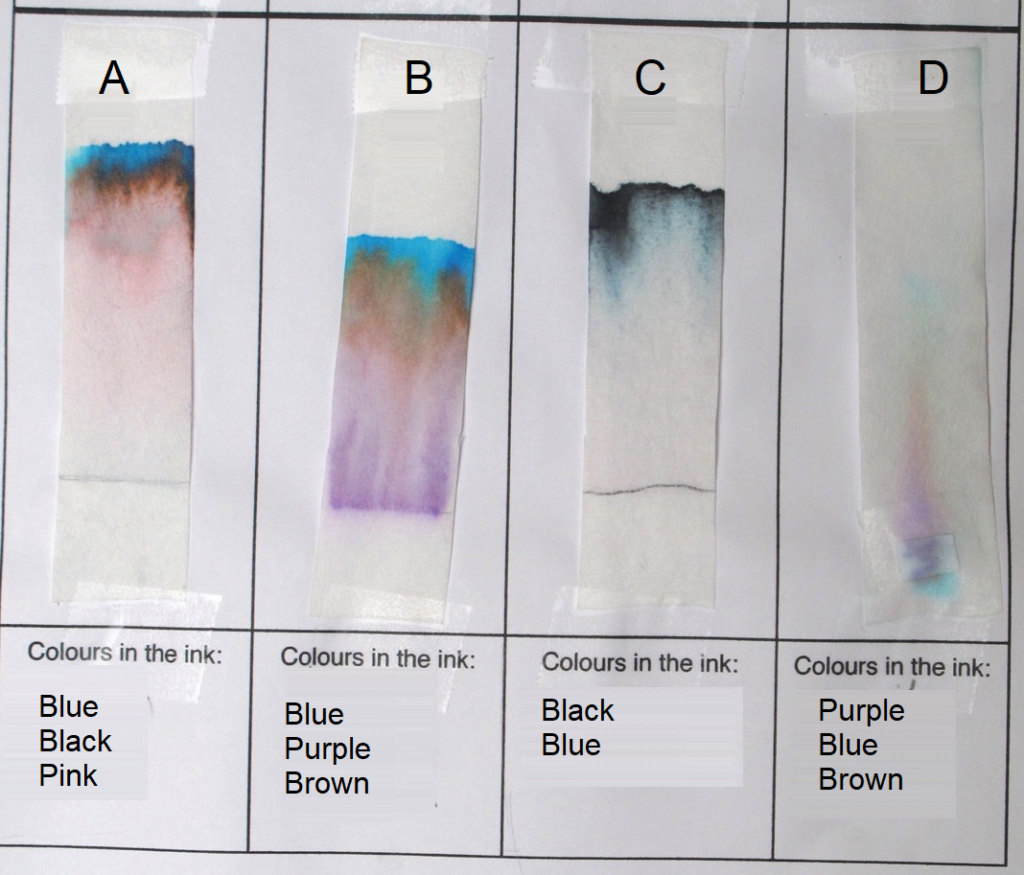 The unique colours in different black pens can be used to identify which pen was used to write a note, showing how chromatography can be used in forensics.