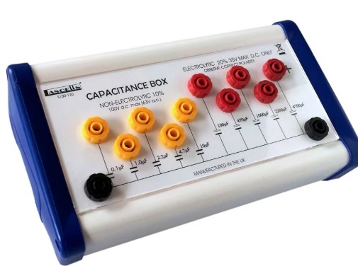 Ten capacitance values in a plastic enclosure measuring 185 x 80 x 65 mm. Five non-electrolytic components of values 0.1, 1.0, 2.2, 4.7 and 10 µF and five electrolytic components of values 100, 470, 1000, 2200 and 4700 µF. All capacitors rated at 63 V with selection by 4 mm sockets.