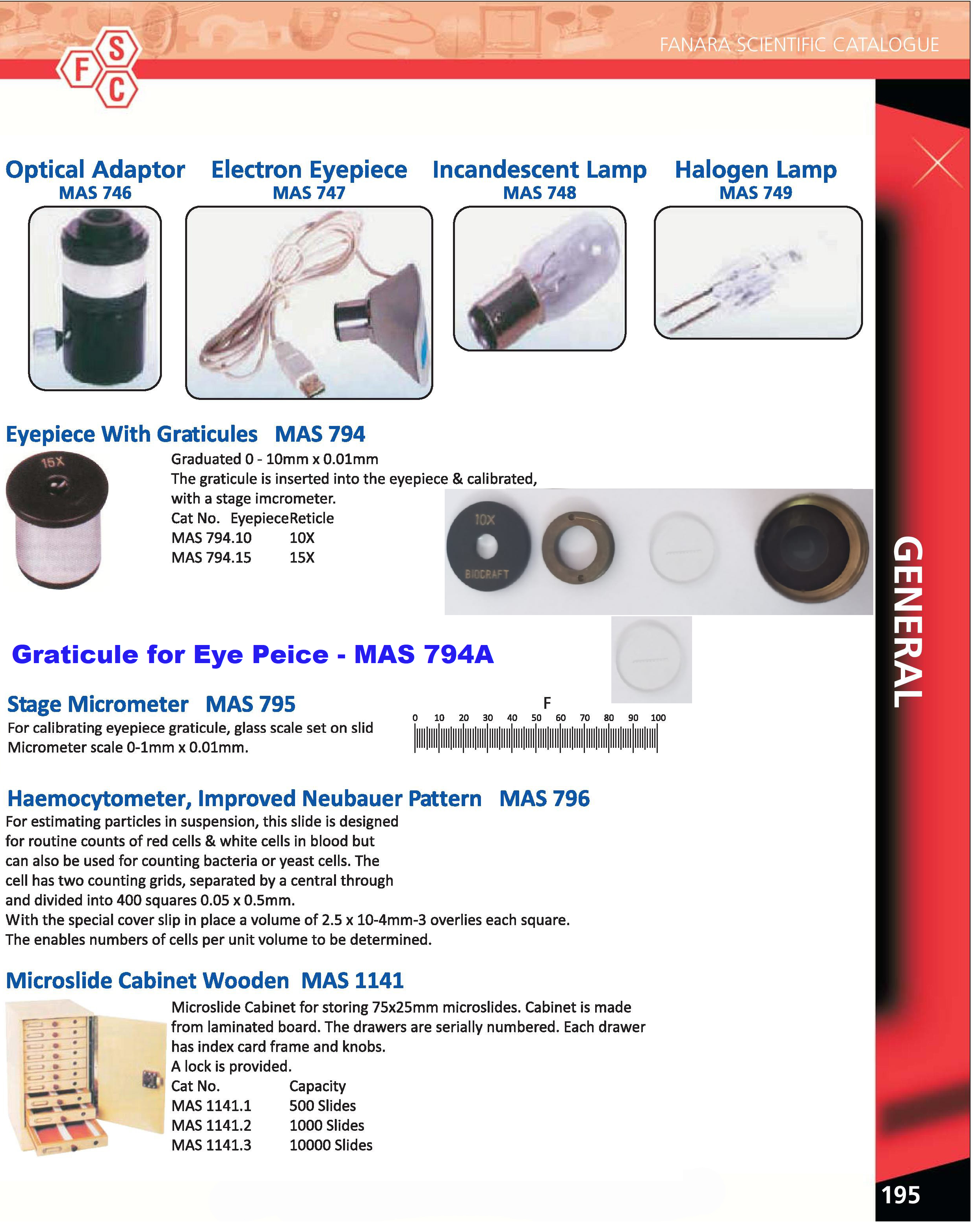 Optical Adapter, Digital Eye-Piece, Microscope Lamp, Eye-piece with Graticules, Stage Micrometer, Haemocytometer, Neubauer Pattern, Microslide Cabinet Wooden