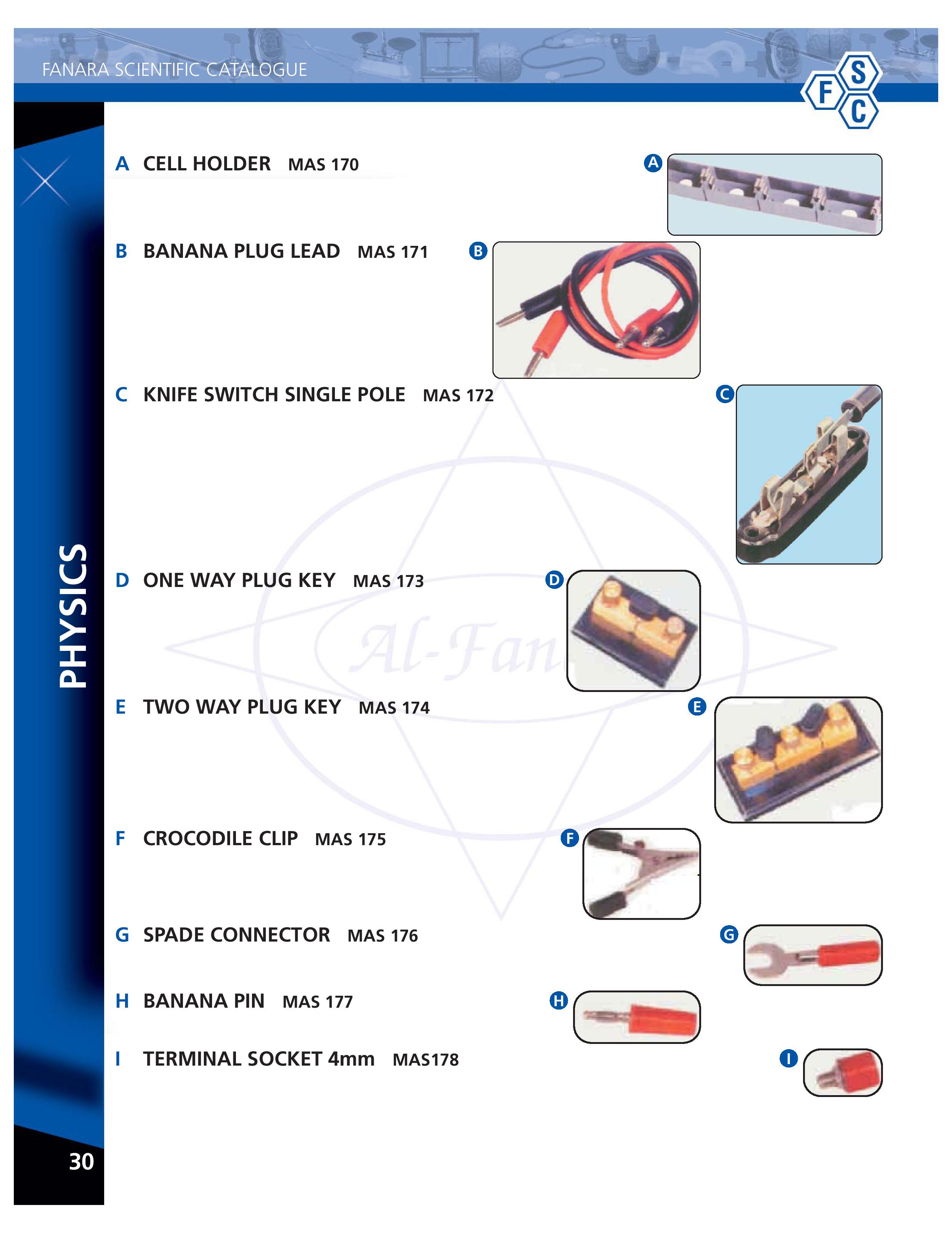 Cell holder-170, Banana Plug lead-171, Knife switch-172, One way key-173, Two way key-174, crocodile clip-175, Terminal socket-178
