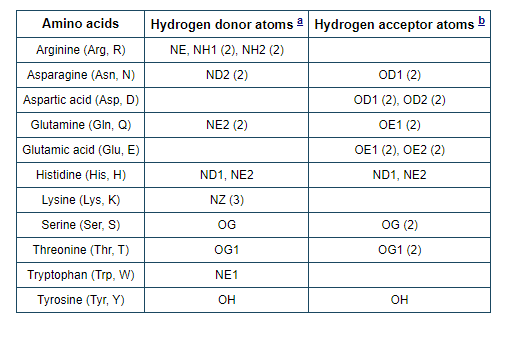 Table 3: Hydrogen donor and acceptor atoms in amino acid side chains.