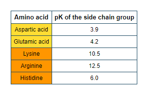 Table 1: pK of the amino acid side chain group. The pK of the side chain group is the pH at which exactly half of a carboxylic or amine group is charged.
