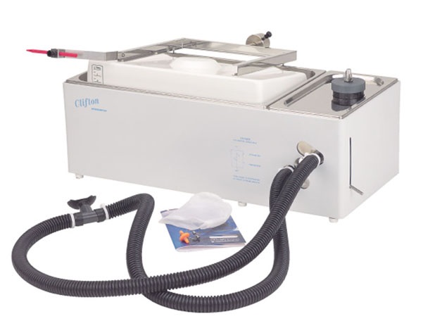 The Clifton Spirometer can be used for investigating tidal volumes, respiratory rate, pulmonary ventilation, reserve volumes and vital capacity. Oxygen consumption can also be measured which is useful in metabolic rate studies. A simple lever control enables the subject to be connected either to the atmosphere or to the float for recording. A container for soda lime crystals is fitted which can be used to absorb carbon dioxide. The Spirometer is designed to offer minimum resistance to airflow. This means greater comfort for the user and more realistic results.