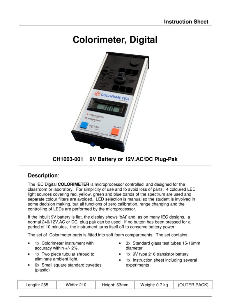 The IEC Colorimeter is a high quality student Colorimeter for the measuring of concentrations of chemical solutions. The LCD display can provide either ‘Transmission’ or ‘Absorption’ measurements.