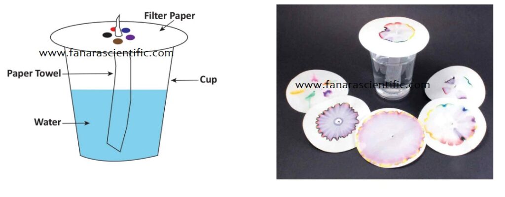 Did you know that the black ink in your markers is not actually black ink? Our chromatography discs allow students to separate most water-soluble inks into their original blended pigments, revealing their hidden identities. Simply make several dots or lines of different colors in the center of the disc using water-soluble markers. Water from a cup is drawn up to the center of a disc using a paper towel. As the water is absorbed into the filter disc the pigments separate into a colorful display. See which inks are pure, and which are blended. Test different types of markers to see which separate the best. Test on other pigments such as those found in flowers. Teaches about light, color, and capillary action. Pack of 100 discs available in 9 cm or 11 cm diameters. (Markers and cups not included.) For ages 6+.