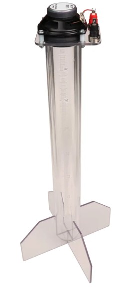 The apparatus features two telescopically nested tubes: the outer tube has a sealed base to contain water and a wide footprint for stability, while the inner tube can be slid to change the length of the air column in closed pipe investigations. A millimetre scale is etched on the inner tube so that the air column length can be easily and readily measured. Open pipe investigations are also possible, simply by using the inner pipe independently. A 5 W loudspeaker mounted at the top connects to an amplified signal generator via 4 mm sockets. This setup allows quick identification of harmonic frequencies and accurate calculation of the speed of sound in air.