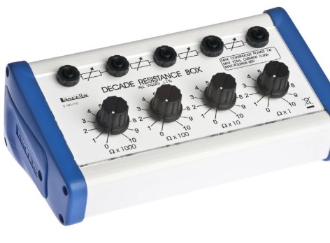 The Lascells Decade Resistance box provides a precise way to vary resistance in a circuit. With four decade dials, resistance can easily be tuned in the range from 1 to 9999 Ohms in 1 Ohm steps. The 4 mm sockets allow for easy connection to student circuits, and allow for the unit to be used as a potential divider.