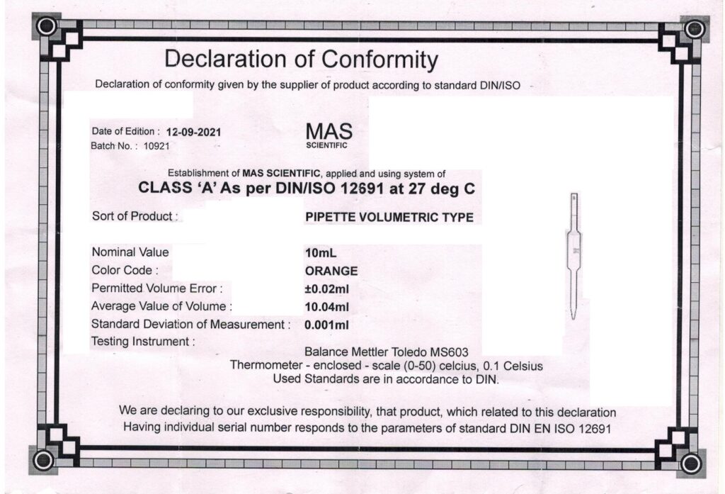 Pipette Volumetric Type, 10ml Batch No. 10921