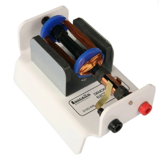 The Demonstration Electric Motor is a ready built fully functional unit showing all the essential features of a simple motor as taught in the KS4 syllabus. A single rectangular coil rotates in a linear magnetic field with a simple commutator and brush arrangement. Field directions can be reversed by reversing the ferrite slab magnets and current direction can be reversed by reversing the leads. Requires DC voltage in the range 1.5 V – 6 V