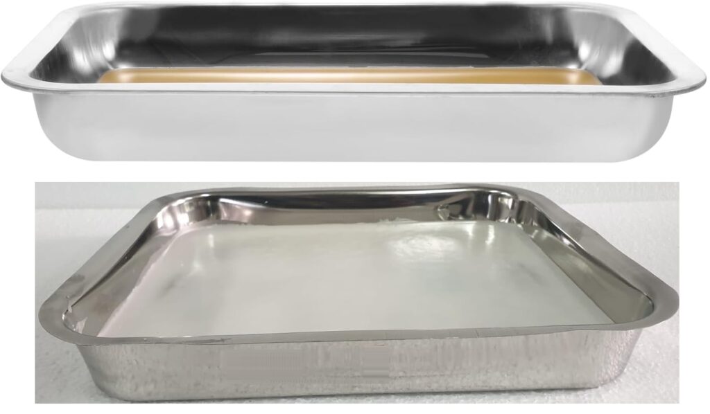 Metal dissection tray. The layer of wax in the bottom of the tray is used to pin tissues in place when dissecting medical and zoological samples and specimens.