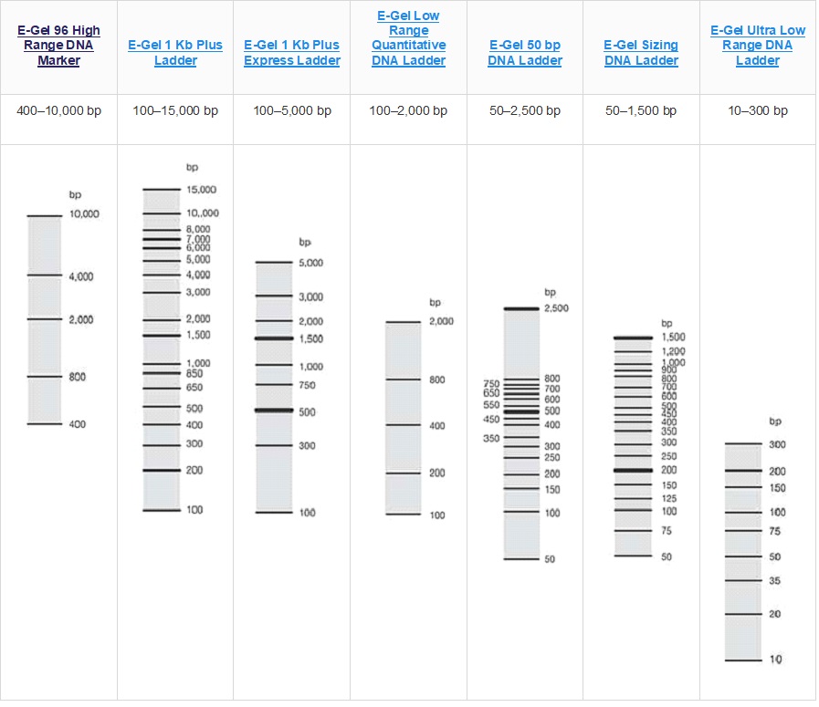 Invitrogen E-Gel DNA ladders are premixed with loading buffer and designed specifically for use with the E-Gel precast agarose gels in sizes ranging from 10 bp to 15 kb.