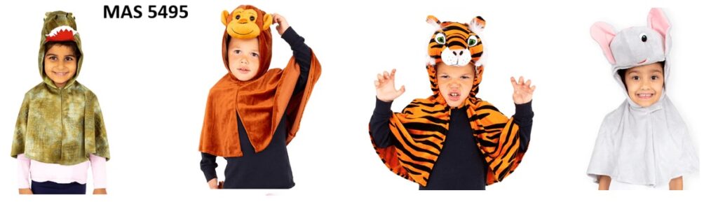 - Set includes four farmyard animal capes: sheep, cow, pig, and chicken