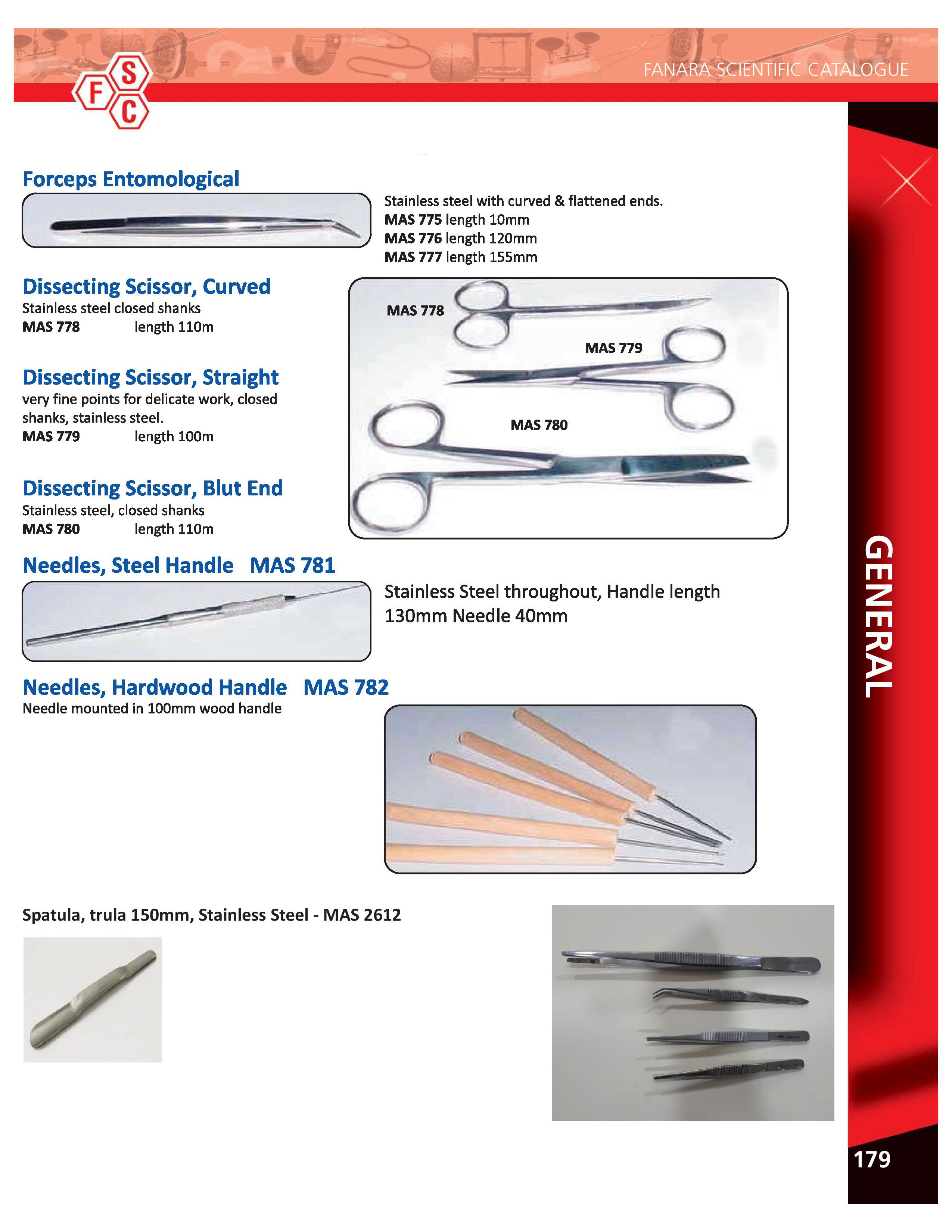 Forceps – Entomological, Dissecting Scissor- Curved, Straight & Blunt End, Needles, Hardwood Handle, Trula Spatula MAS 775 / 776 / 777 / 778 / 779 / 780 / 781 / 782 / MAS 2612