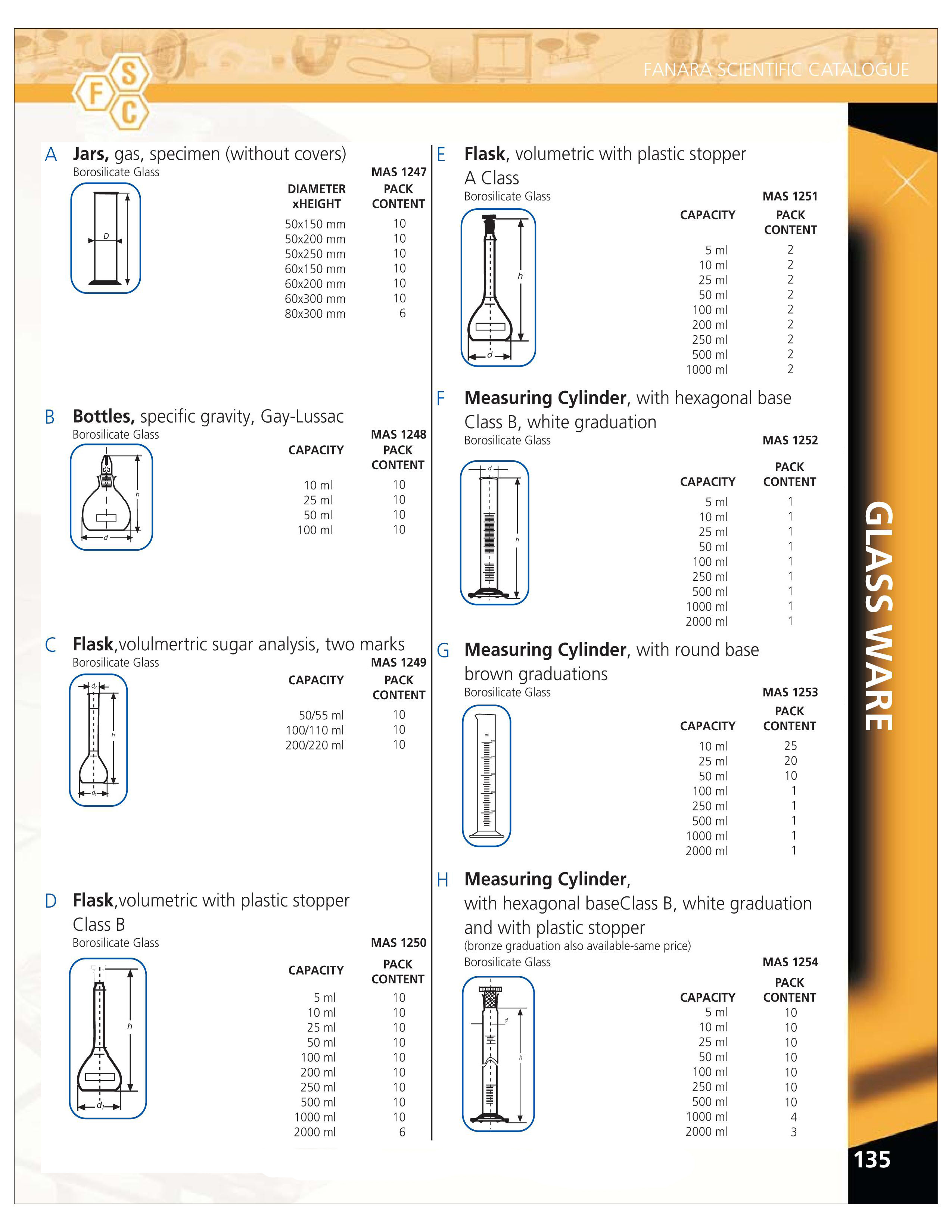 Gas jar, Specific gravity Bottle, Volumetric Flask, Measuring Cylinders