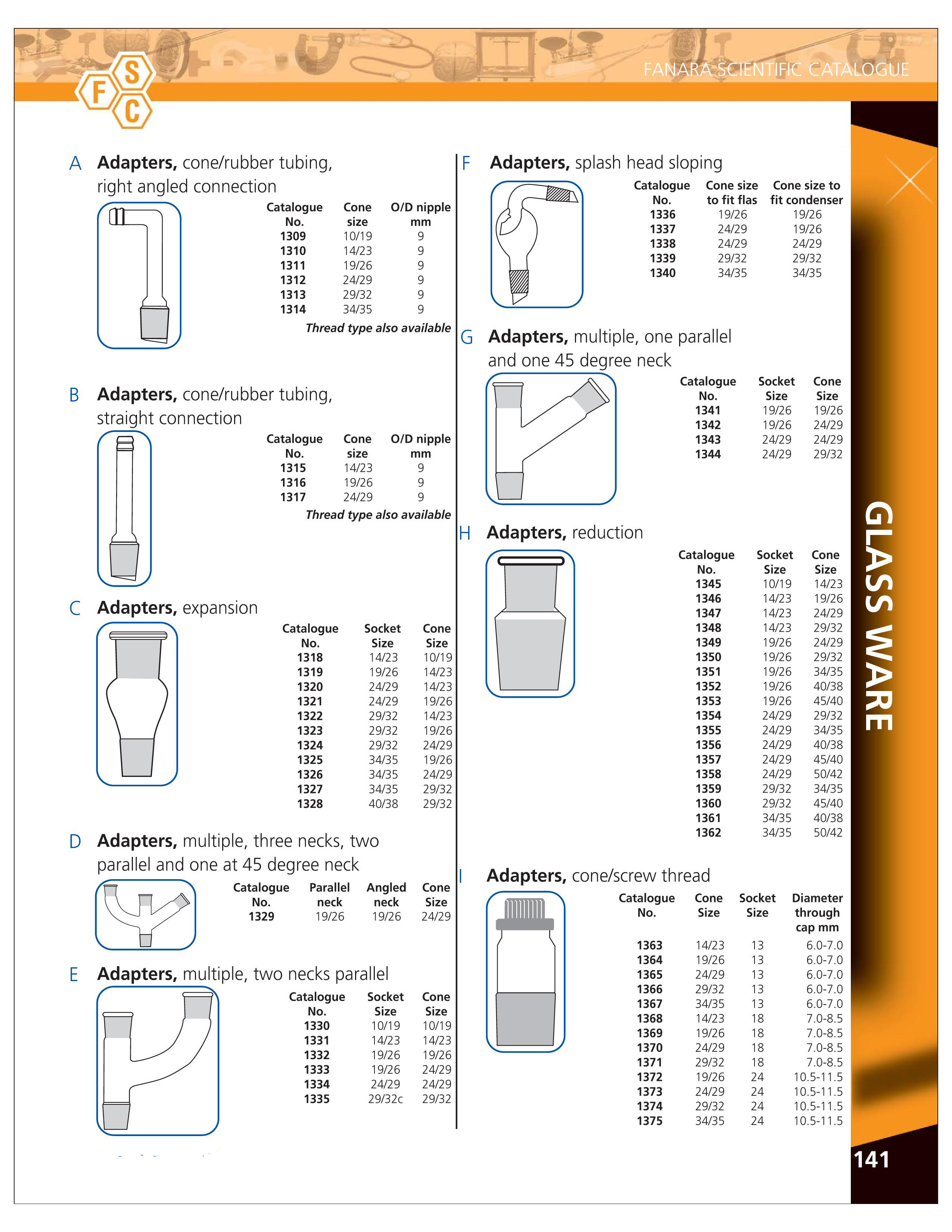 Glass Joints Adopters, 3-Necks, 2-necks, Splash Head, Receiver, Reduction, Expansion Adopter