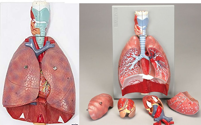 Life size. Dissectible into 7 parts. Heart (2 parts), larynx (2 parts), and lungs are shown with great attention to detail. A portion of the diaphragm is included. Mounted on a base. Size (without base), 36 × 20 × 12 cm.