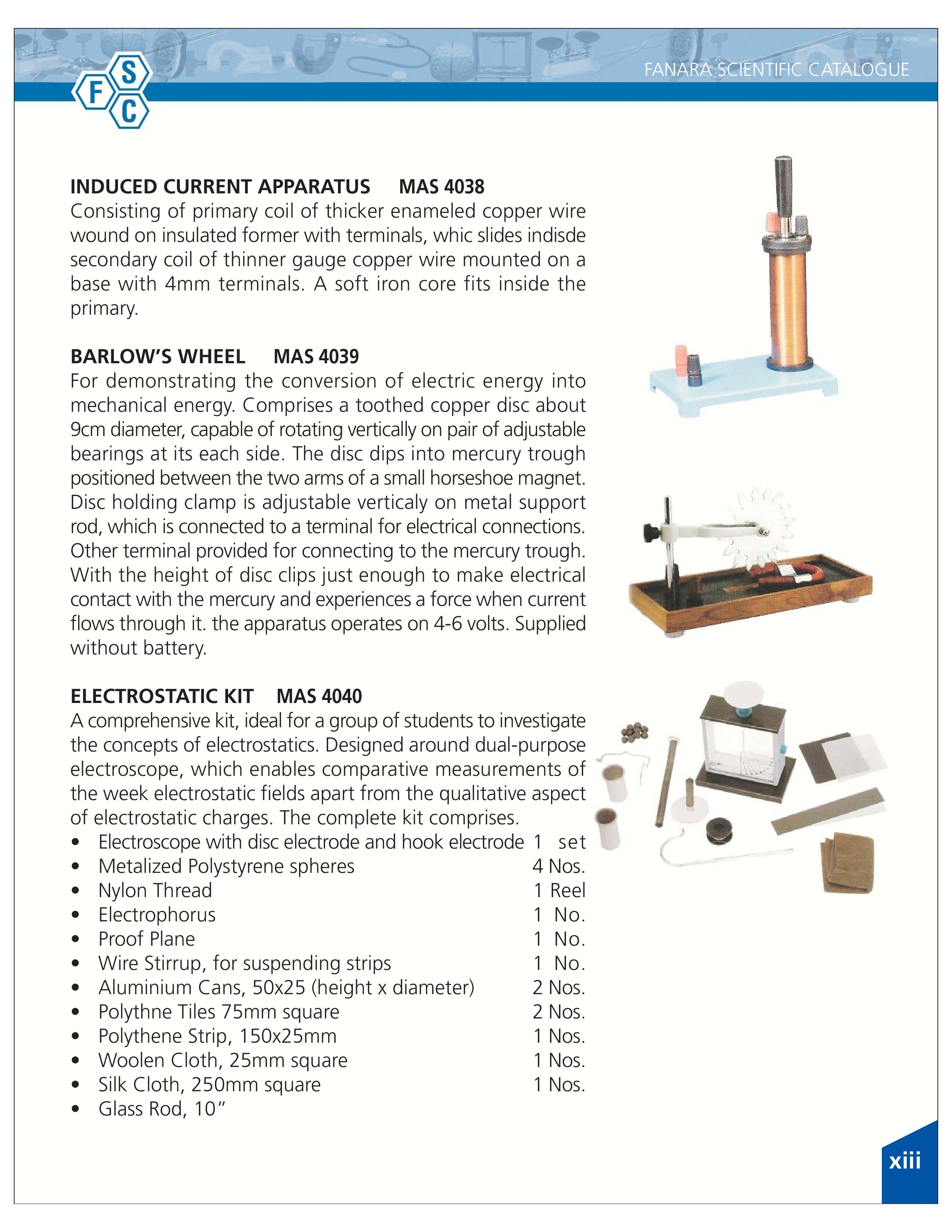 Induced Current Apparatus 4038, Barlow’s Wheel 4039, Electrostatic Kit 4040
