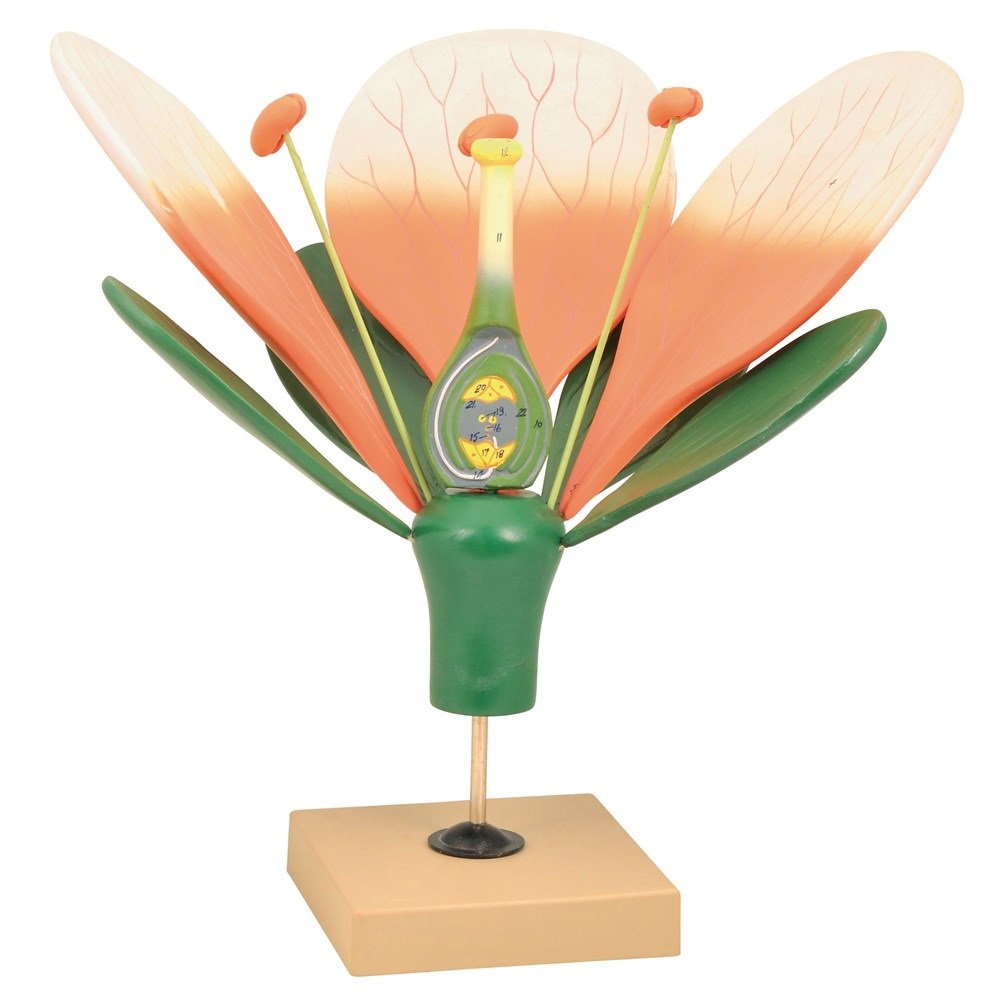 Large flower Model, model teaches the reproductive function of flowers, angiosperm pollination, and fertilization. It incorporates all 4 floral series: the sterile calyx (sepals) and corolla (petals); the fertile androecium (stamens) and gynoecium (pistil). Three petals, 4 sepals, and 4 stamens are detachable. Two anthers are sectioned open to expose pollen grains. The ovary is dissected to reveal the 7-celled female gametophyte.