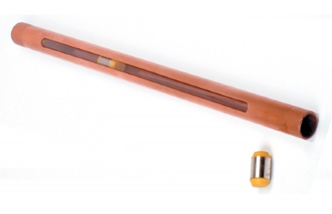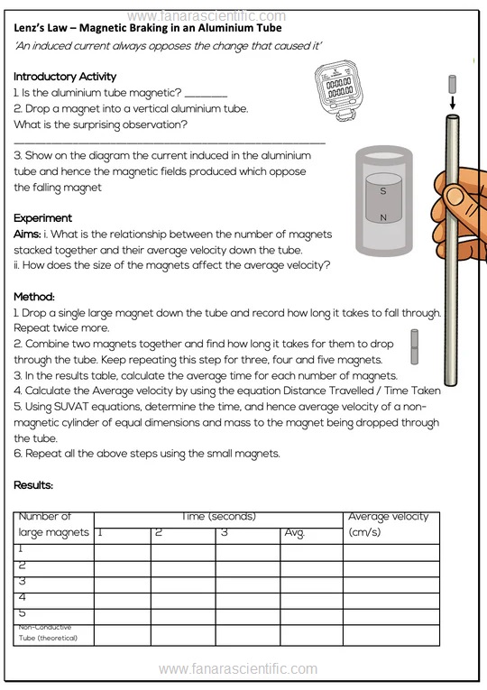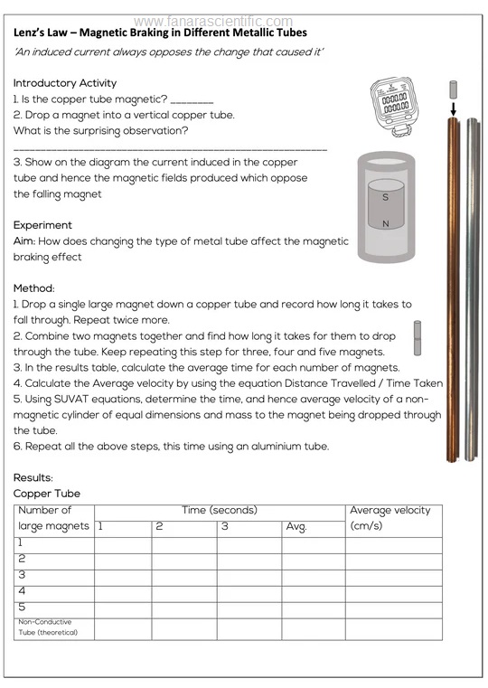 Kit used to demonstrate Lenz’s Law containing a copper tube with a narrow transparent slot along its length, two identically sized plugs, one of non-magnetic steel and one of magnetised neodymium. Complete with instructions. Supplied with full supporting teacher’s notes. Experience the fundamental principle behind electric motors with this demonstration. Drop the strongly magnetized plug through the copper pipe, and induced currents cause it to fall very slowly. The unmagnetized plug falls without resistance. Viewing window lets you see the action, and yellow plug ends make them easier to see. Experiments and information included. Lenz’s Law Apparatus allows you to demonstrate electric and magnetic forces. Electric current generated by a moving magnet will always oppose the original motion of the magnet that created the current. Amusement Park thrill rides use this same principle for braking |