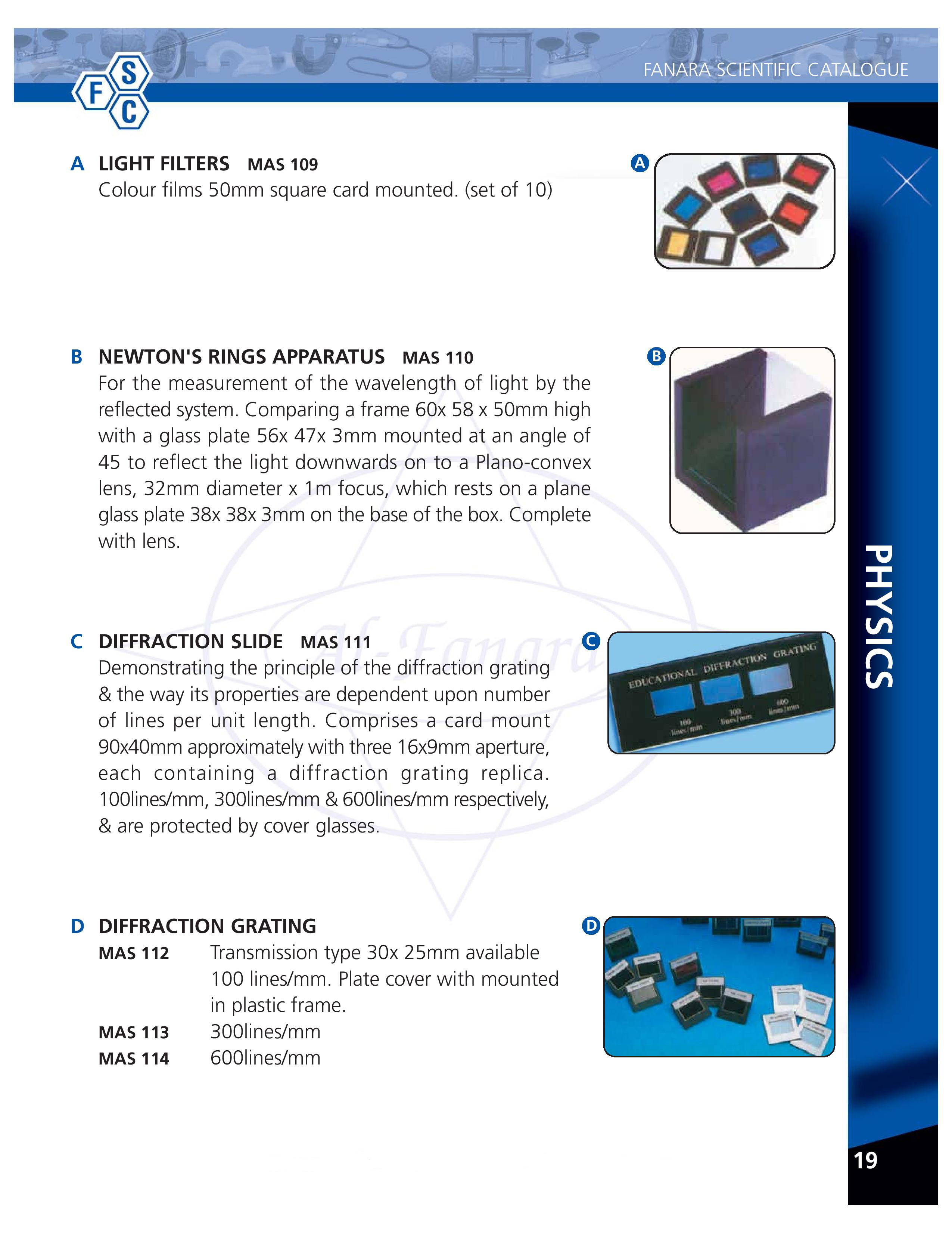 Light filters-109, Newton’s rings Apparatus-110, Diffraction slide-111, Diffraction Grating-112/113/114 MAS 109-110-111- 112- 113- 114