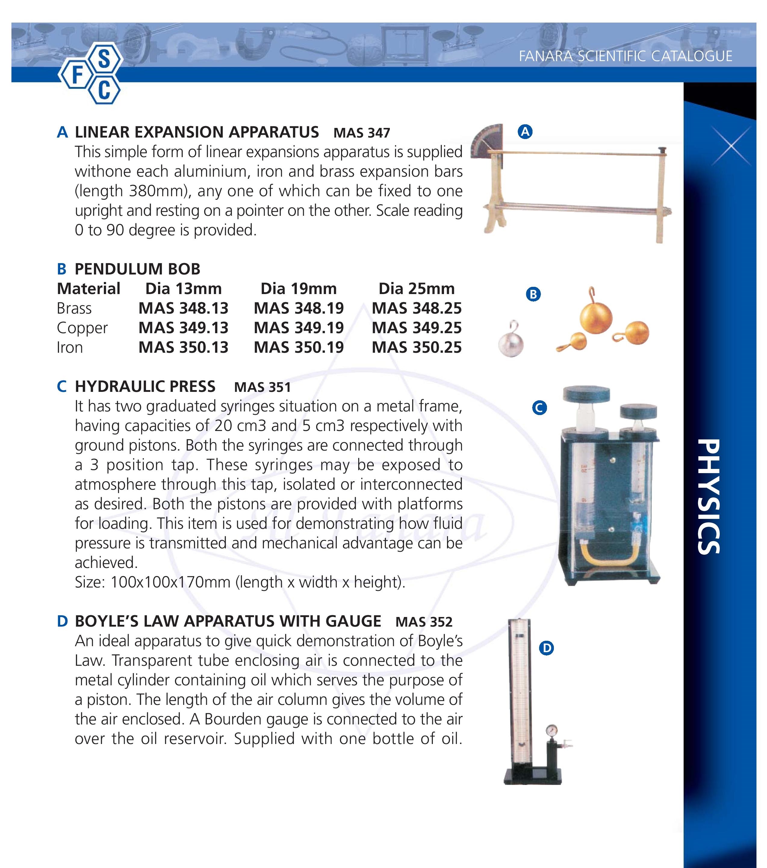 Linear Expansion-347, Pendulum Bob-348, Hydraulic Press-351, Boyle’s Law with Guage-352