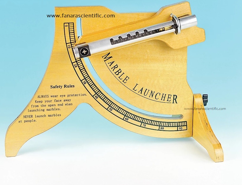 Durable apparatus to study velocity, acceleration, and projectile motion. Marbles can be launched from five different speeds at any angle between 0 and 90°. Velocity of the marble can range from 3 m/s to 9 m/s. Easy-to-read protractor allows for precise measurements and calculations. Sturdy hardwood construction is built to last. Includes a detailed instruction guide and two marbles. 16″ L x 10″ W x 11½” H.