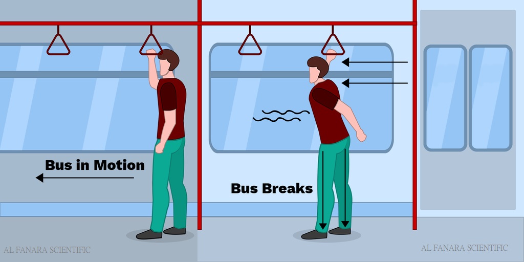 A person standing on a moving bus titls forward when the brakes of the bus are applied.