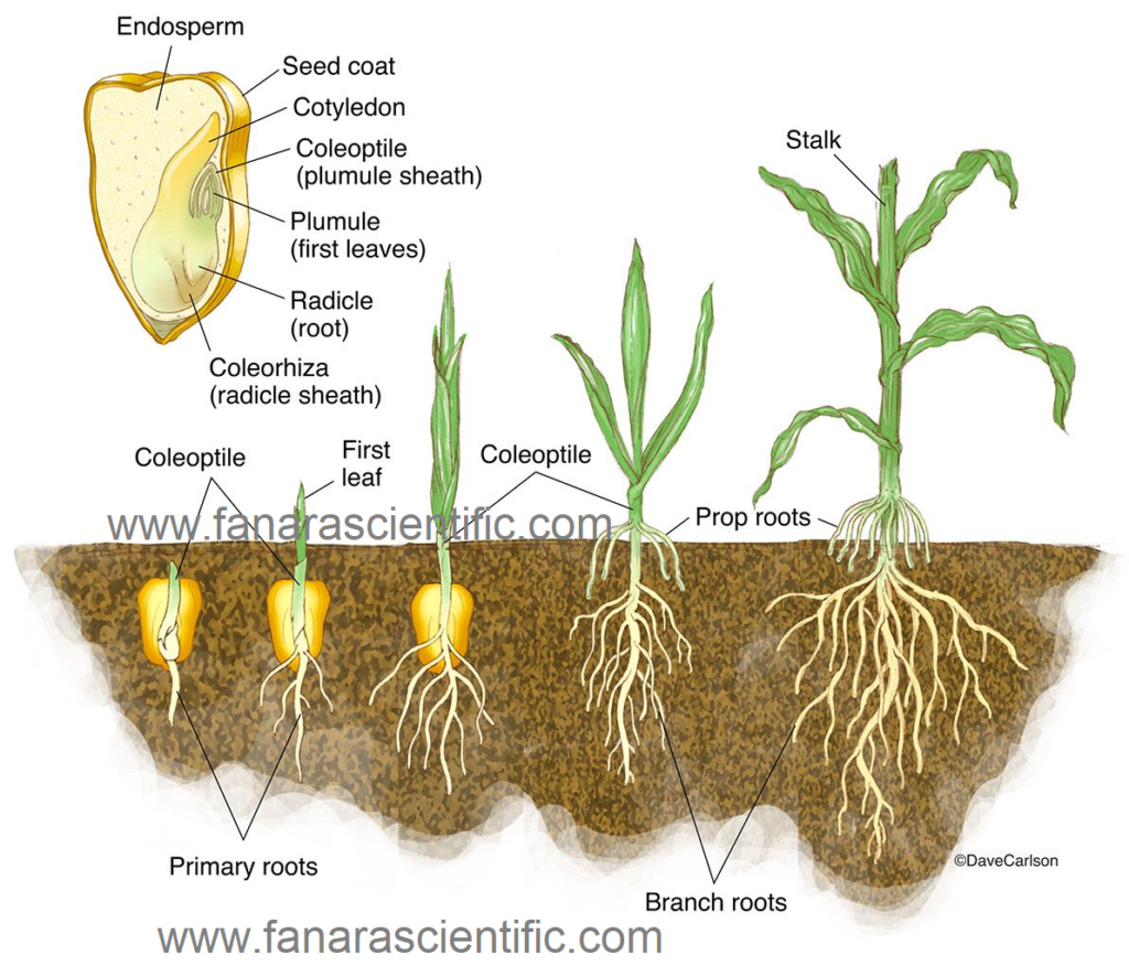 Like other members of the grass family, corn is a monocot. It has only one cotyledon or seed leaf. Corn plants contain both male and female flowers in different locations on the plant. An ear of corn is actually a female flower stalk, resting between the sheaths of the leaf and stem.