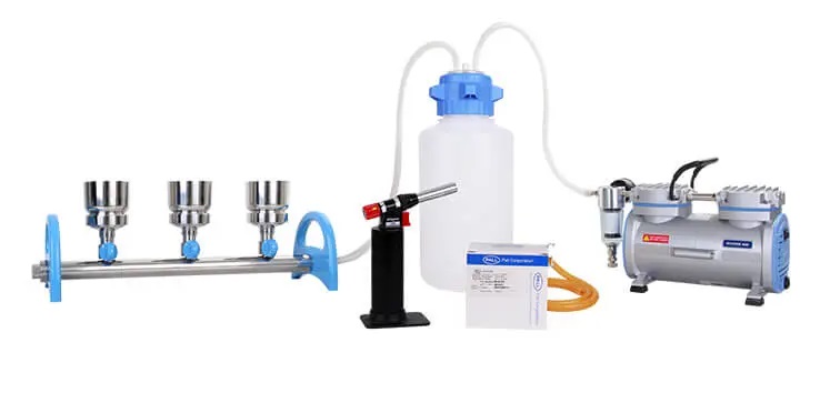 Multi-Branch Filtration system are designed for a large number of samples filtration on microbiology test and suspended solid test. Each system includes vacuum pump, manifold, burner, waste bottle and filter.
