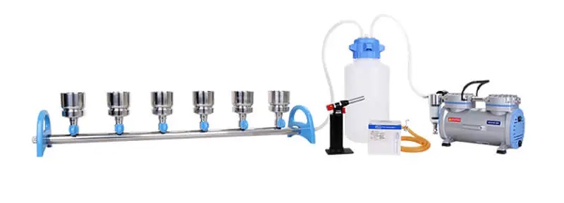 180600-11-T (22-T) | MultiVac 601-MB-T, Vacuum Filtration System, complete set includes : ▸ Rocker 400, Oil Free Vacuum Pump ▸ MultiVac 600-MB, 6 Places Stainless Steel Manifold ▸ SF, 100 ml Stainless Steel Funnel (6 pcs) ▸ 4000 ml PP Vacuum Bottle with drain ▸ Dragon 100, Torch Burner ▸ MCE Membrane, 47 mm, 0.45 μm, 200/PK ▸ Silicone Tube (1m x 2pcs) |