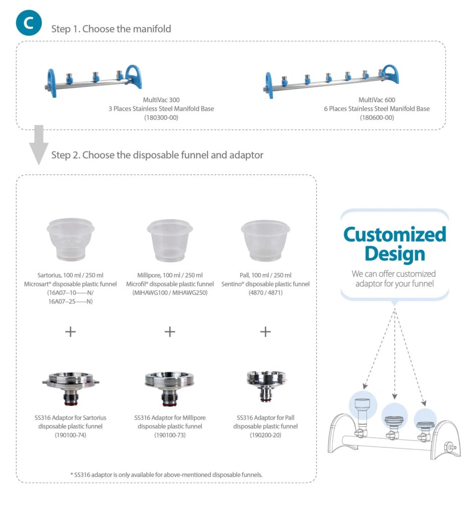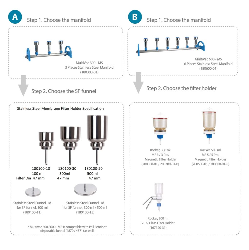 MultiVac 300 – MS manifolds include No. 8 silicone stoppers that are adaptable to most filter holders.