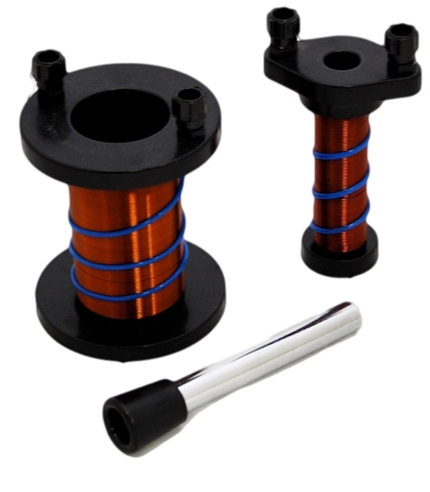 | This larger primary and secondary coil set is designed so that teachers can provide a larger, more visible demonstration in a classroom setting. The secondary coil slides over the primary coil, and the soft iron core slides into either or both. This rugged device is sensitive enough to be used with voltmeters instead of galvanometers. The coils are wound around hollow plastic cores, with a turns ratio of approximately 2 (@380) to 1 (@200). Provides a look at electromagnetic induction, ferromagnetism and transformer theory.