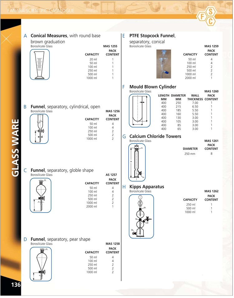 Separating Funnels, Conical measures, Calcium Chloride Tower, Kip’s Apparatus- MAS 1255-1256-1257-1258-1259-1260-1261-1262