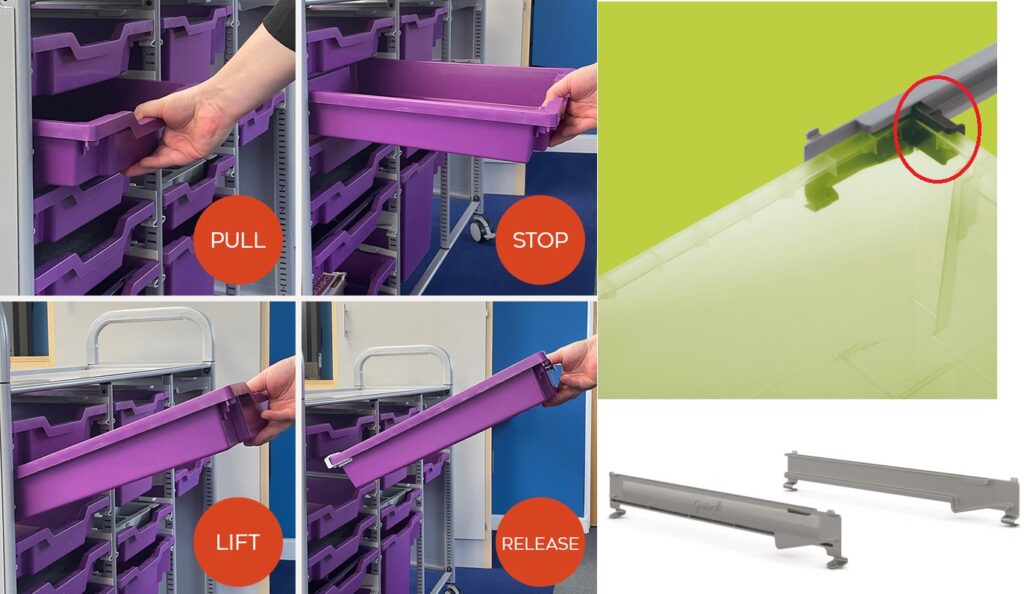 The StopSafe runner has a built-in stop for enhanced safety meaning trays can only be pulled out up to a certain point. No need to worry about them being dropped, causing accidents or injuries. With StopSafe the trays can be pulled right out so that teachers and learners can see the contents and make their selections but have to be lifted in order to remove it. This design makes it safe and easy for students to access resources without adult support. Therefore, teachers and assistants are freed up to spend more time facilitating the learning and providing support to children with additional needs. The runner can be replaced individually if needed, increasing the sustainability of the storage solution. Furthermore, tray clips are also included meaning that all standard Gratnells trays can be converted to be used with StopSafe runners. For use with Gratnells Callero or Gratnells Dynamis trolleys and frames.