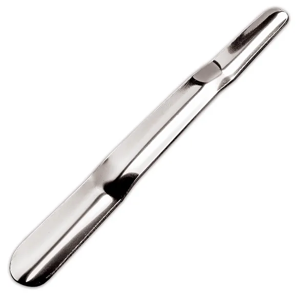 Raised centre section, one end flat and bent up and other end formed into a scoop. Made from Stainless steel.