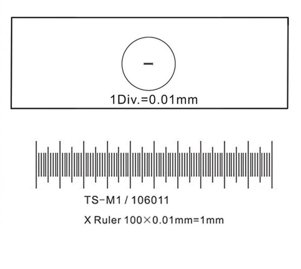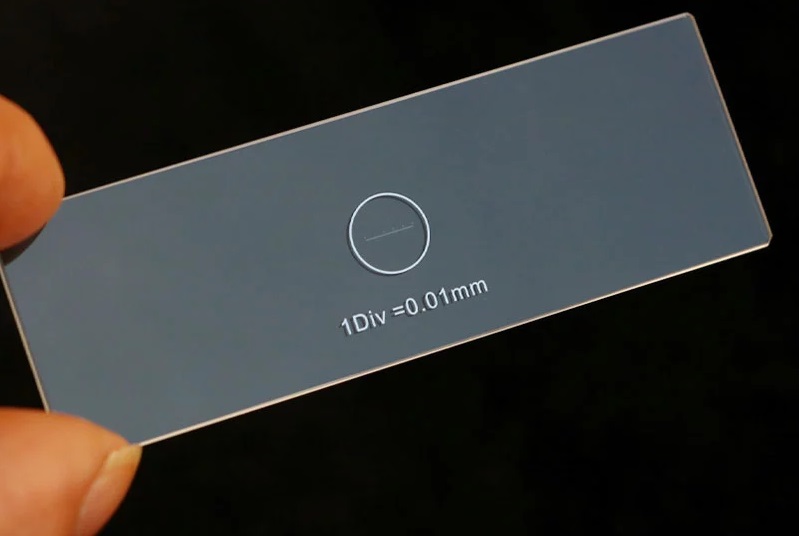 Stage Micrometer with 1mm scale subdivided into 100 divisions of 0.01mm (10µm).