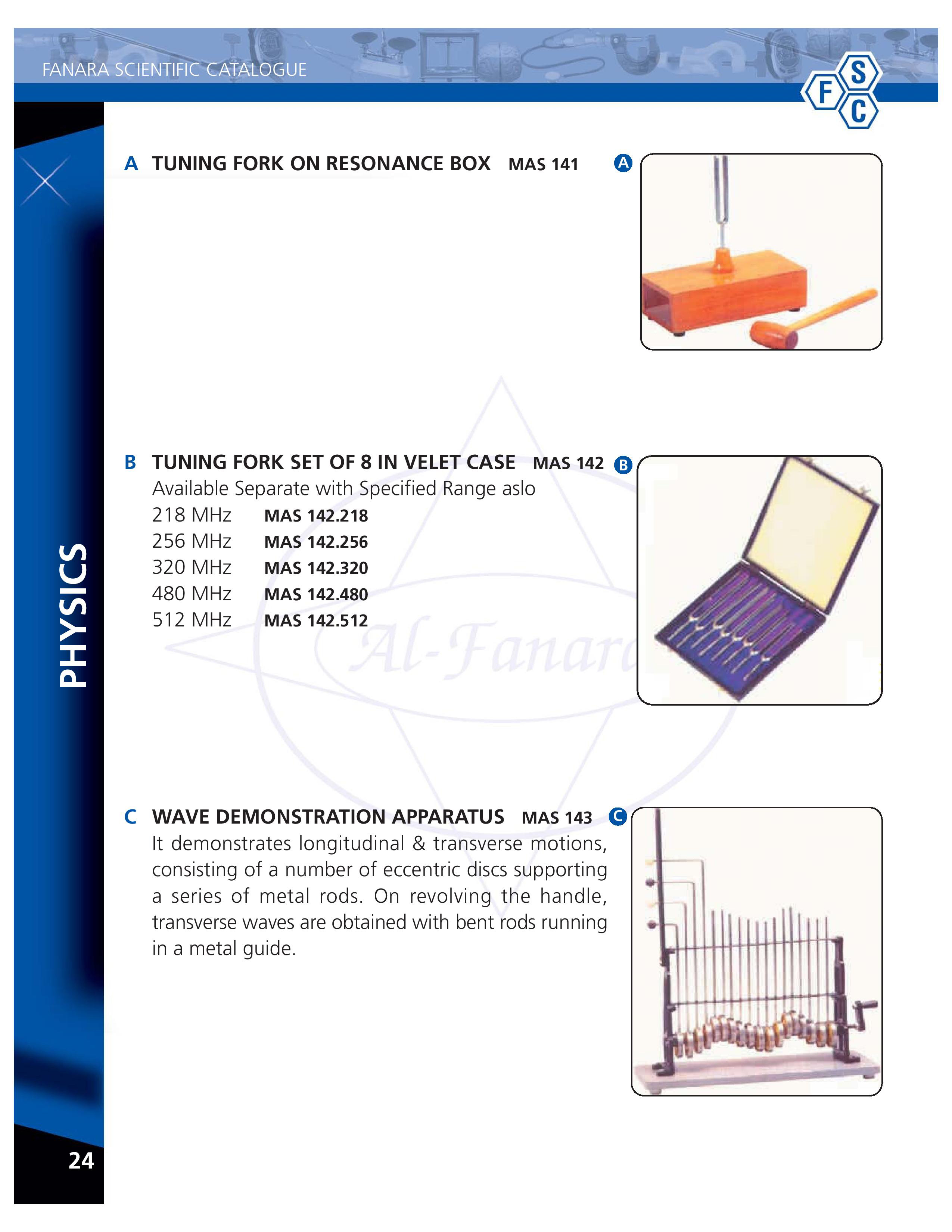Resonance Box with Tuning Fork-141, Tuning fork set of 8 in velet case-142, Wave demo Apparatus-143