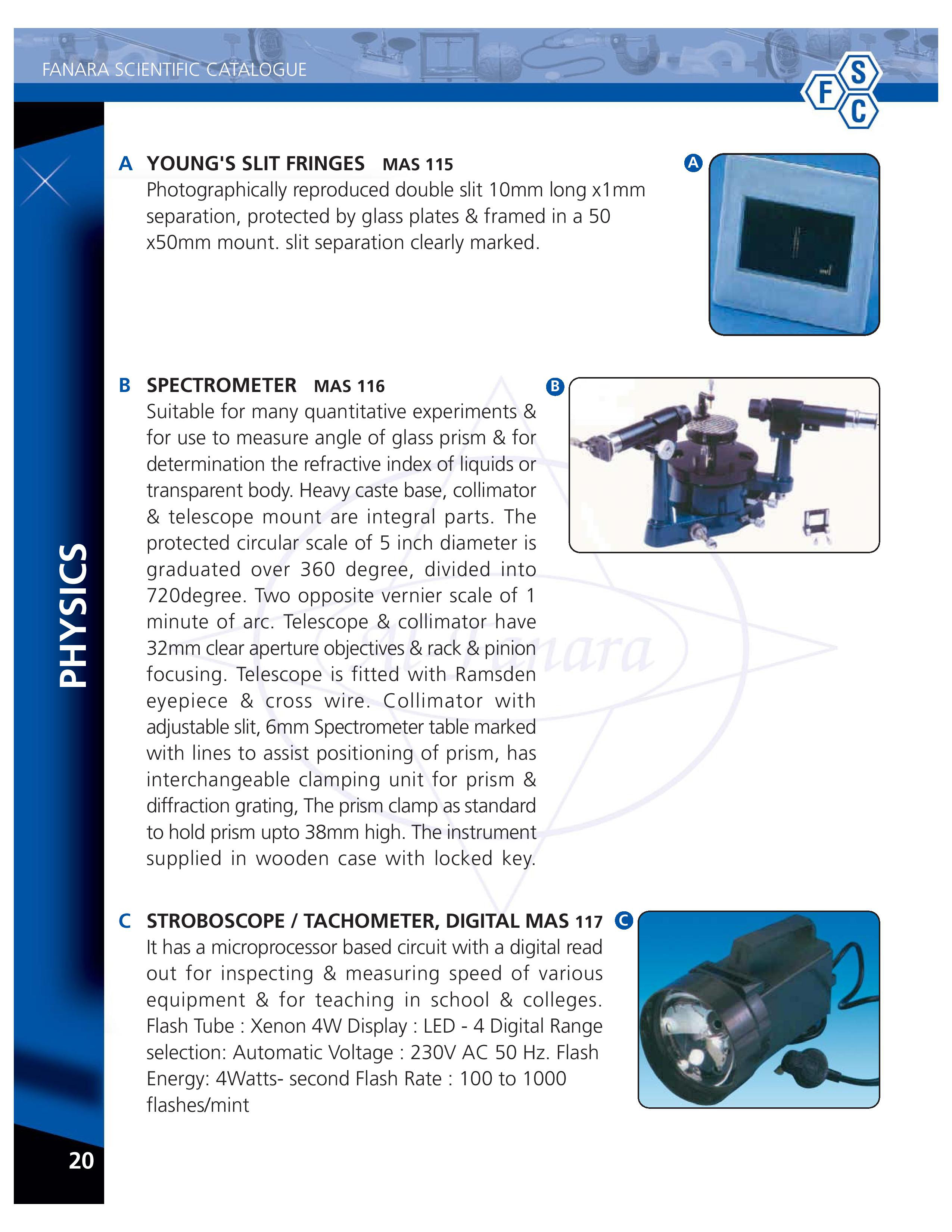 Young’s slit-115 , Spectrometer Double stage-116, Stroboscope/Tachometer-117